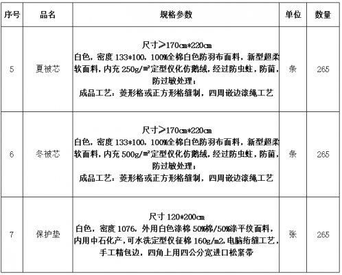 三、用戶需求書中附件1《司機(jī)公寓床品需求明細(xì)表》序號(hào)5、序號(hào)6、序號(hào)7規(guī)格參數(shù)修改如下,其余未修改項(xiàng)仍按原比選文件執(zhí)行: